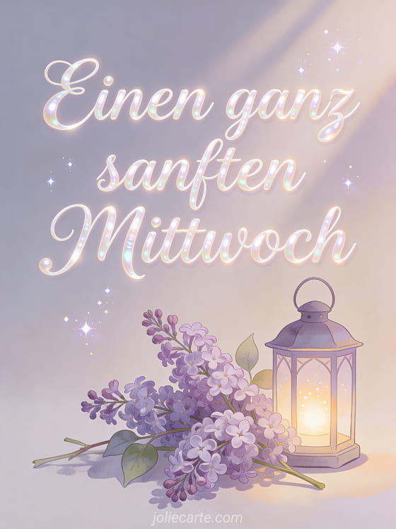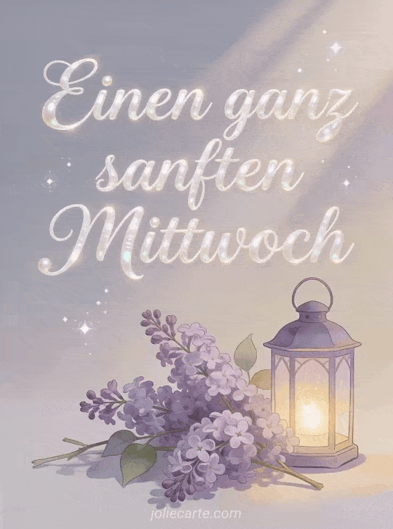 Teile einen sanften Mittwochsgruß mit fließender Kalligrafie, perligem Leuchten, Fliederzweigen neben einer kleinen Laterne, warmen Morgenstrahlen und luftigen Funken. Entdecke auch Hallo schönen Mittwoch Humor, Guten Morgen es ist Mittwoch gif oder animierter schöner Mittwoch.