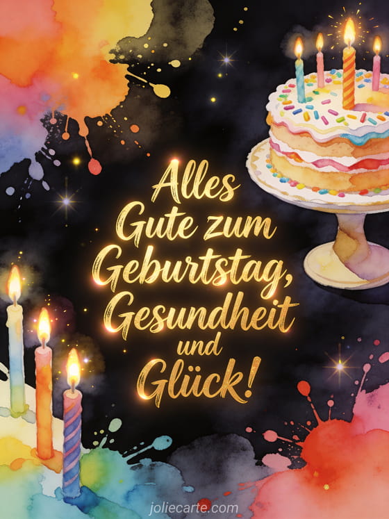 Wünsche ihm Gesundheit und Glück mit einer lebendigen digitalen Aquarell-Geburtstagskarte mit goldener Brush-Schrift, leuchtenden Farbspritzern, Geburtstagskerzen, einem dekorierten Kuchen und festlichem Funkeln. Du kannst auch eine kostenlose Geburtstagskarte für Männer Facebook, eine Geburtstagskarte Mann Auto oder eine Karte für mann geburtstag witz senden.