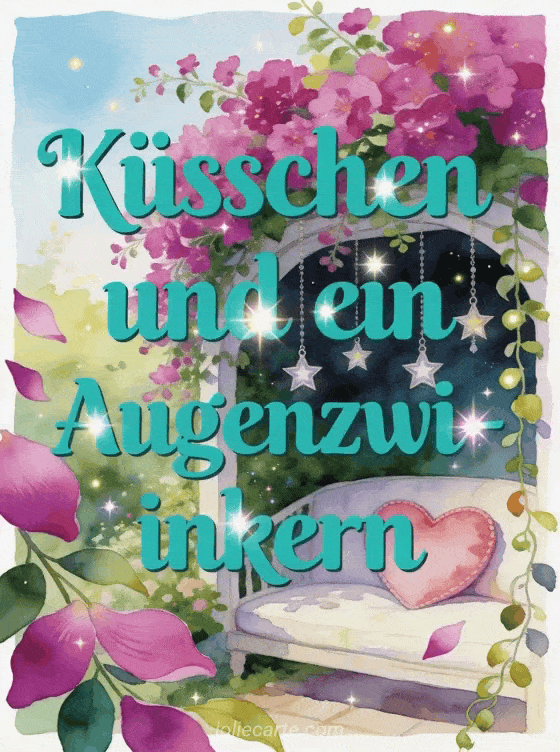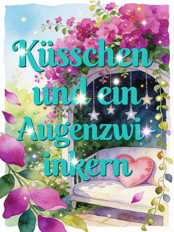 Teile eine verspielte Nachricht mit leuchtend türkisfarbener Schrift, Sternlichtern, einer Gartenecke, Fuchsienblüten, hängenden Sternanhängern, einem herzförmigen Kissen, rankenden Blättern und festlichem Funkeln. Dazu passen auch Küsschen senden GIF, ein Küsschenregen GIF oder Küsse senden GIF.