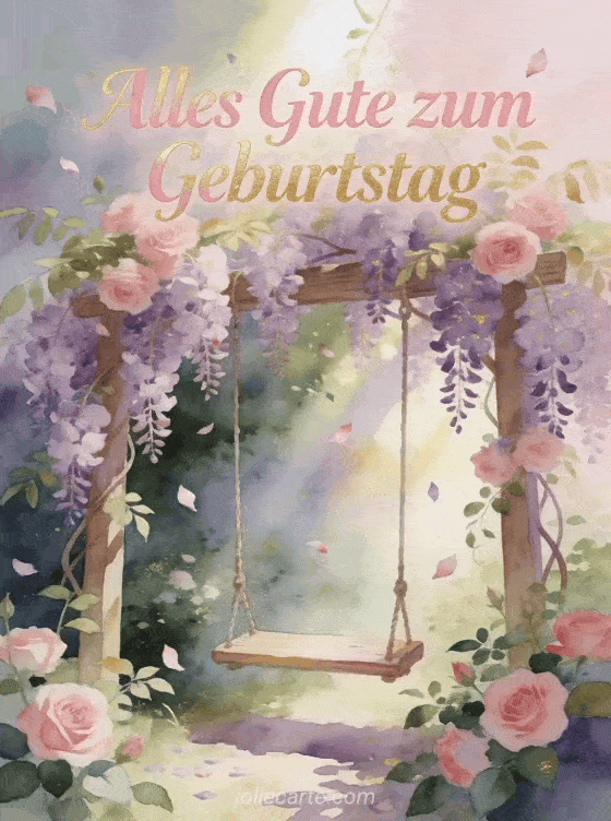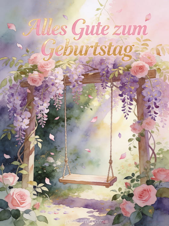 Teile diese verträumte Karte mit geheimem Garten, Schaukel in Glyzinien und märchenhafter Aquarellstimmung. Entdecke auch gif Humor Geburtstag Frau, alles Gute zum Geburtstag Frau Text und Dromedar Geburtstagskarte Frau.