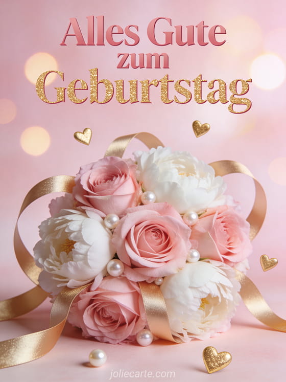 Feiere mit einer eleganten Geburtstagskarte mit rosa Rosen, weißen Pfingstrosen, Perlen, goldenen Bändern und sanftem Licht. Entdecke auch alles Gute zum Geburtstag auf dem Wasser, alles Gute zum Geburtstag Katze Bild und geburtstag ecard minimalistisch.