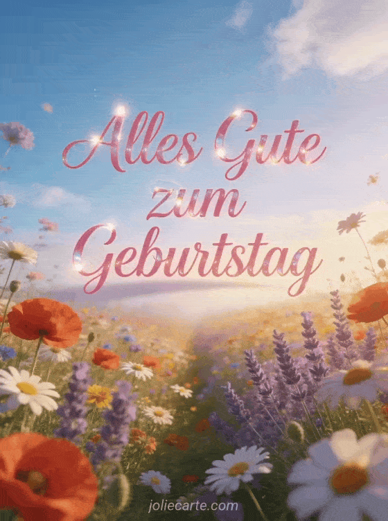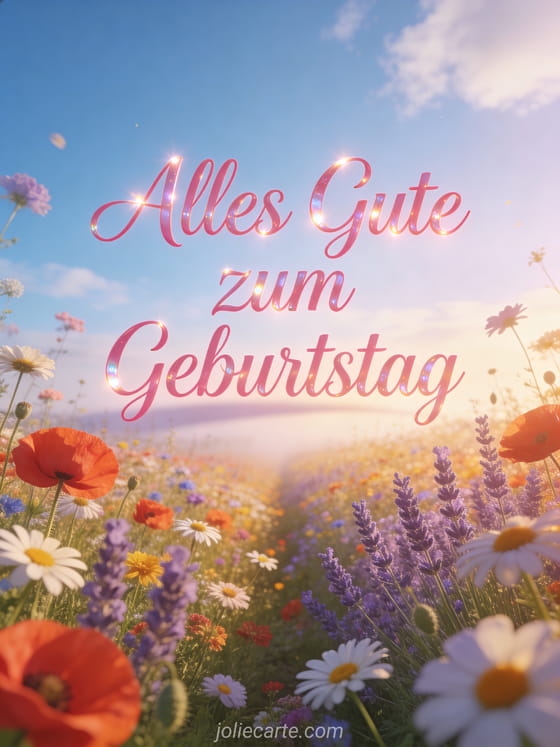 Feiere mit einer strahlenden Geburtstagskarte mit Blumenfeld unter blauem Himmel, mit Mohnblumen, Margeriten, Lavendel und goldenem Nachmittagslicht. Entdecke auch alles gute zum geburtstag musikalisch, alles gute zum geburtstag bilder und Geburtstagsworte.