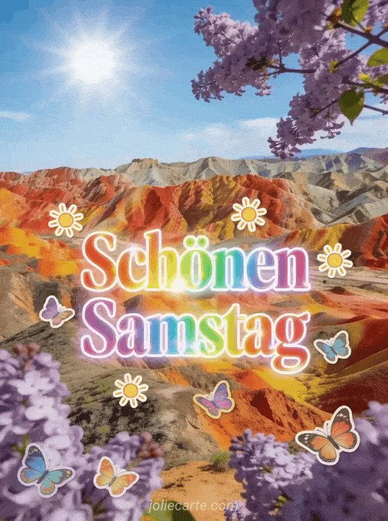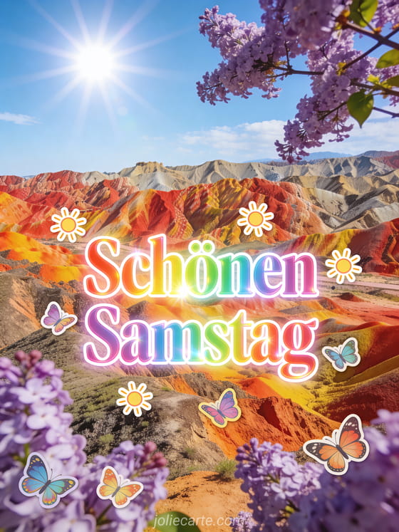 Teilen Sie eine spektakuläre Karte zum schönen Samstag mit leuchtender Regenbogenschrift, strahlenden Sonnenstickern, bunten Schmetterlingen, den rot, orange und gelb gestreiften Bergen von Zhangye Danxia und violetten Fliederzweigen im Vordergrund. Sehen Sie auch schönen Tag schönen Samstag Küsse, diese Guten Morgen Samstag Karte oder Samstag Küsschen GIFs.