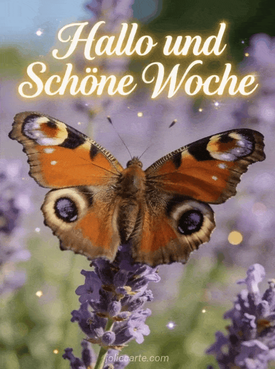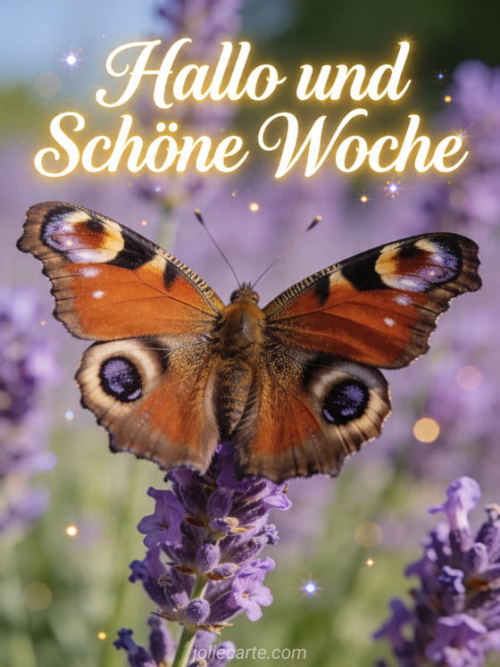 Teile mit dieser kostenlosen Karte ein sanftes Hallo und schöne Woche mit einem Schmetterling auf einem Lavendelzweig im sommerlichen Garten. Entdecke auch schönen tag und schöne woche, sonnige woche oder guten morgen schöne woche.