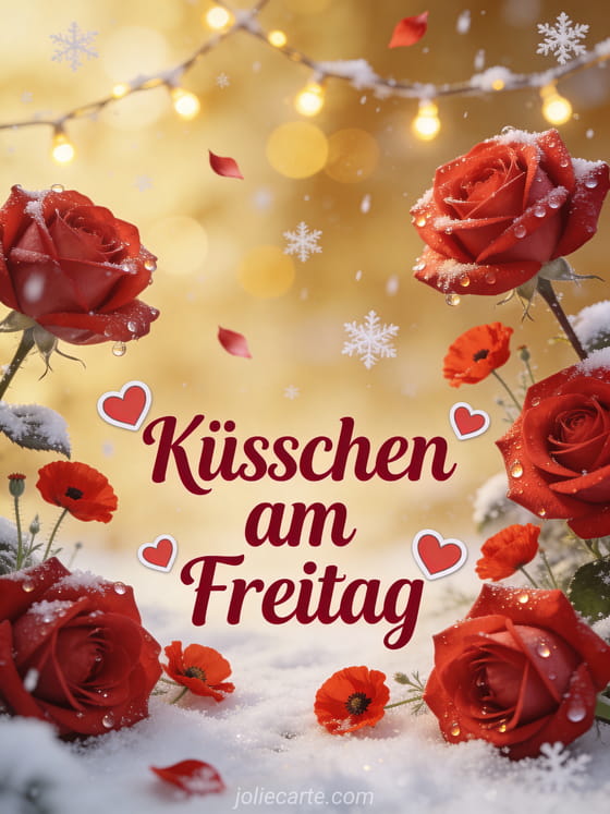 Teile Küsschen am Freitag mit roten Rosen, Mohnblumen, kleinen Herzen, zarten Schneeflocken und warmem goldenem Glanz. Entdecke auch Guten Morgen schönen Freitagmorgen, Cyber-Schönen-Freitag-Karte oder schöne Bilder um einen schönen Freitag zu wünschen.