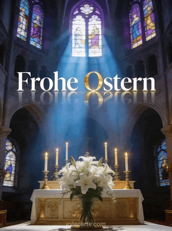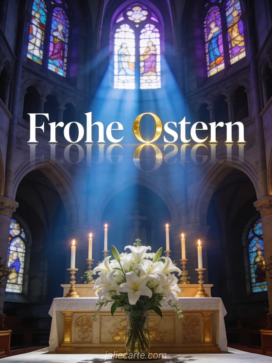 Feiern Sie Ostern mit dieser wunderschönen katholischen Grußkarte mit einem majestätischen Kathedralen-Inneren, leuchtenden Buntglasfenstern und weißen Lilien. Entdecken Sie auch eine religiöse Osterkarte, christliches Osterbild oder katholische Ostergrüße.