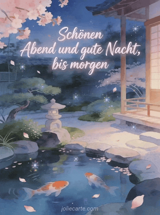 Teile einen sanften Abendgruß mit dieser Zen-Karte in einem japanischen Garten bei Dämmerung mit Koi-Fischen und fallenden Kirschblütenblättern. Entdecke auch schönen abend gute nacht küsschen bis morgen, landschaft schönen abend bis morgen oder schönen Abend bis morgen.