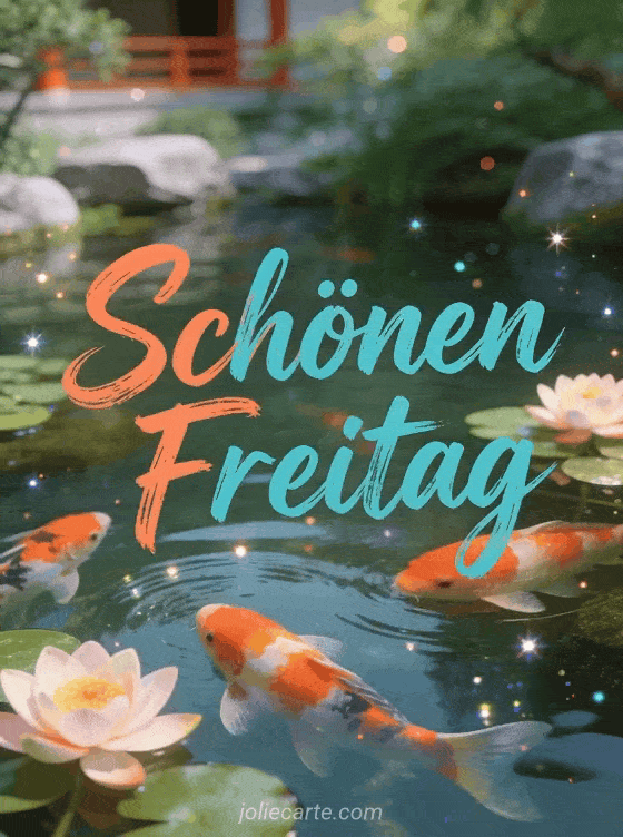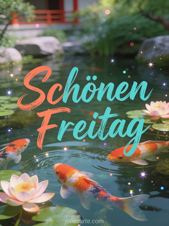 Teile ein Zen-Bild zum schönen Freitag mit einem friedlichen Koi-Teich und Lotusblüten. Entdecke auch eine guten Morgen Freitag Humor Karte oder eine schönen Freitag Bild Karte.