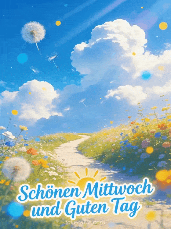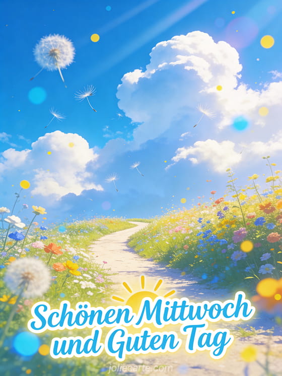 Verschönere den Mittwoch von jemandem und wünsche ihm einen guten Tag mit dieser sonnigen Karte eines gewundenen Weges durch eine bunte Blumenwiese. Entdecke auch schönen mittwoch lustiges bild oder bild schönen sonnigen mittwoch.