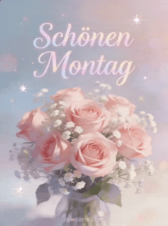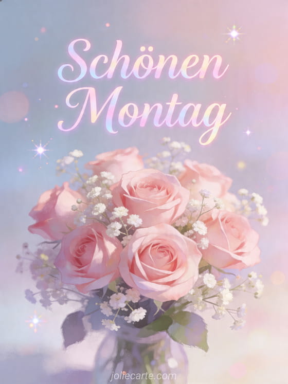 Verschicke eine sanfte Schönen-Montag-Karte mit rosafarbenen Rosen und Schleierkraut für einen liebevollen Start. Entdecke auch bild schönen montag und gute woche, kaffee schönen montag humor und montag bild guten morgen.
