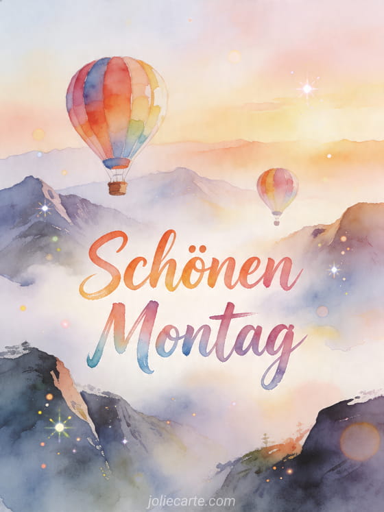 Verschicke eine Schönen-Montag-Karte mit bunten Heißluftballons über nebligen Bergen für einen inspirierenden Start in die Woche. Entdecke auch schönen montag lustig, schönen montag und schöne woche und viel kraft schönen montag.