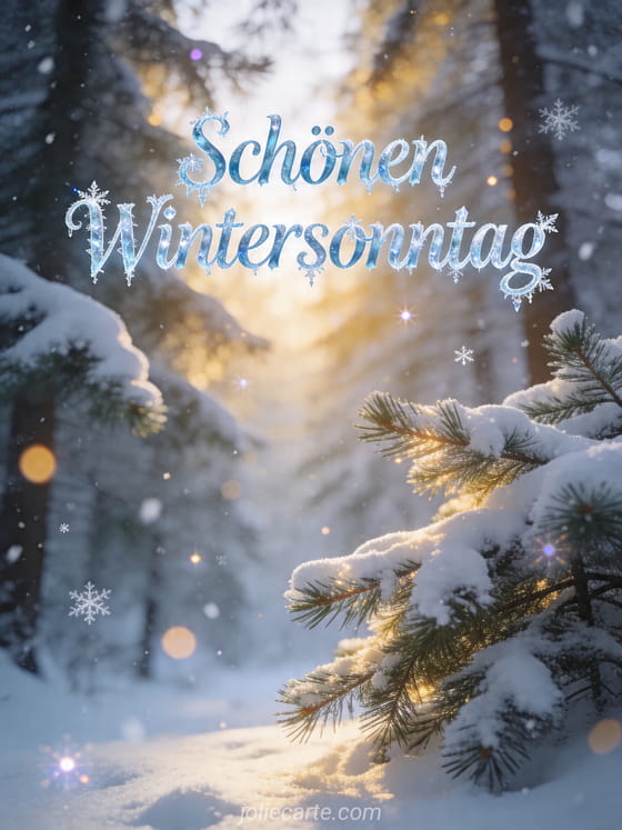 Senden Sie einen friedlichen Gruß zum Wintersonntag mit dieser stillen Karte aus verschneitem Wald, Tannenbäumen und sanftem Schneefall. Entdecken Sie auch schönen sonntag, nachricht von schönen sonntag oder guten morgen schönen sonntag animiertes gif.