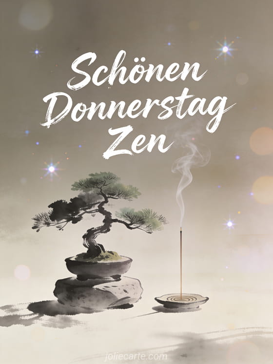 Teile einen minimalistischen Donnerstaggruß mit einem ruhigen Bonsai auf einem Steinpodest und sanft aufsteigendem Weihrauchrauch. Entdecke auch eine schöner Donnerstag Mut oder eine schöner Donnerstag Tag Karte.