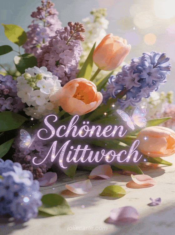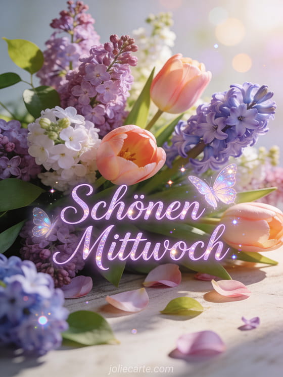 Verschönere jemandem den Mittwoch mit dieser wunderschönen Karte mit einem frischen Frühlingsstrauß aus Flieder, Tulpen und Hyazinthen im Morgenlicht. Entdecke auch eine Karte schöner Mittwoch schönes Bild, eine Karte guten morgen mittwoch oder eine Karte schonen mittwoch kusschen.