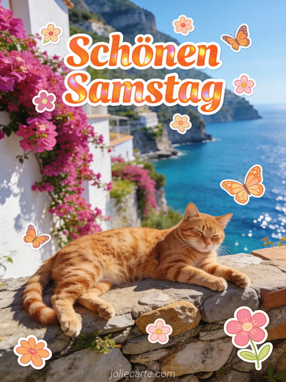 Feiere das Wochenende mit diesem fröhlichen Bild schöner Samstag mit Katze. Entdecke auch eine Karte schönen Samstag meine Liebe oder eine Karte schönen Samstag und guten Tag.