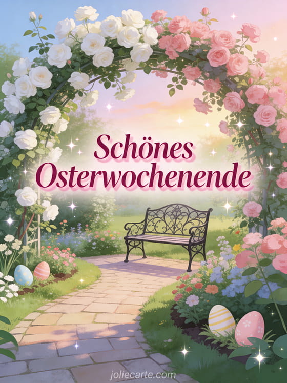 Wünschen Sie ein schönes Osterwochenende mit dieser romantischen Karte mit einem üppigen englischen Garten, Kletterrosen, einer Schmiedeeisen-Bank und versteckten Ostereiern. Entdecken Sie auch eine Osterwochenende-Karte, schönes Osterwochenende-Bild oder Osterwochenende-Grüße.