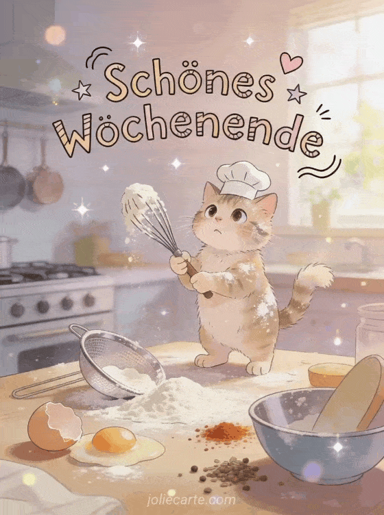 Teilen Sie diese lustige Karte Schönes Wochenende mit einer verwirrten Katze im kleinen Kochhut, Mehl und chaotischer Küche. Entdecken Sie auch schönes wochenende euch allen zitat, lustiges schönes wochenende humor animiertes gif und ich wünsche ihnen ein schönes wochenende.