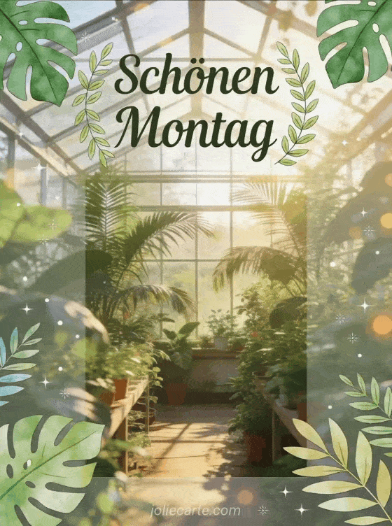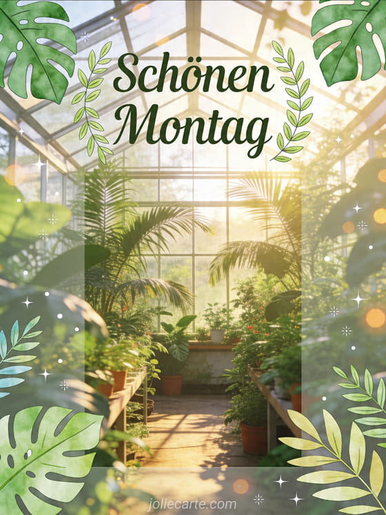 Verschicke eine Schönen-Montag-Karte mit üppigen tropischen Pflanzen in einem Gewächshaus für einen frischen Wochenstart. Entdecke auch guten morgen montag bilder, bild schönen montag küsschen und bild schönen montag und gute woche.