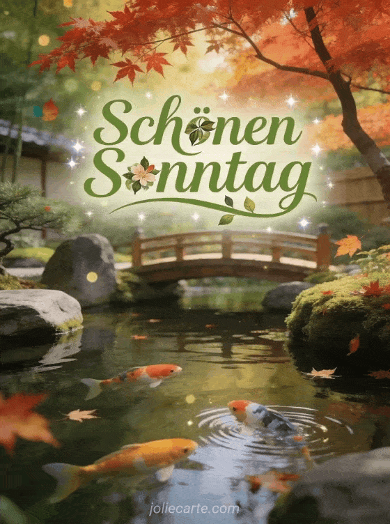 Teile einen beruhigenden Gruß zum schönen Sonntag mit apfelgrüner Schrift, einem stillen japanischen Garten, einem Koiteich und einem roten Ahornbaum in Zen-Atmosphäre. Entdecke auch eine Karte für schönen Sonntag mit der Familie, ein Guten-Morgen-Sonntag-Bild oder eine Karte für schönen Sonntag mein Schatz mit Küssen.