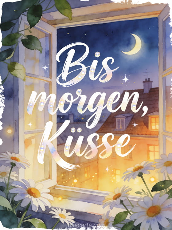 Sende eine liebe Nachricht bis morgen mit Margeriten in Aquarell, einer Mondsichel und warmen Lichtern über den Dächern. Entdecke auch eine Karte für halt durch bis morgen, eine Karte für hallo bis morgen oder eine Karte für schönen tag bis morgen.