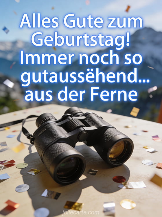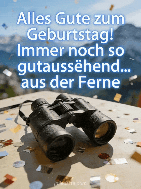 Teile diese humorvolle Karte mit Fernglas, verstreutem Konfetti und weicher Bergkulisse für einen ironischen Geburtstagsgruß. Entdecke auch Geburtstagsnachricht lustig, mann gif geburtstag humor und lustig alles Gute zum Geburtstag.