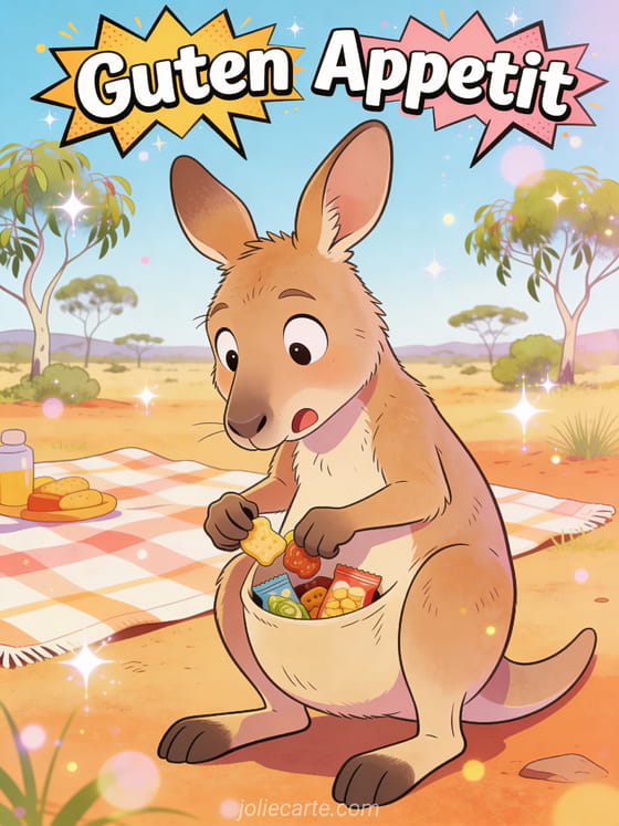 Verschicke einen Lacher mit dieser lustigen Guten-Appetit-Karte mit einem Cartoon-Känguru beim überraschenden Picknick. Entdecke auch eine Guten-Appetit-Bilder-Karte oder eine Mittagessen-Guten-Appetit-Karte.