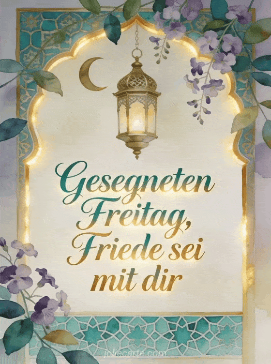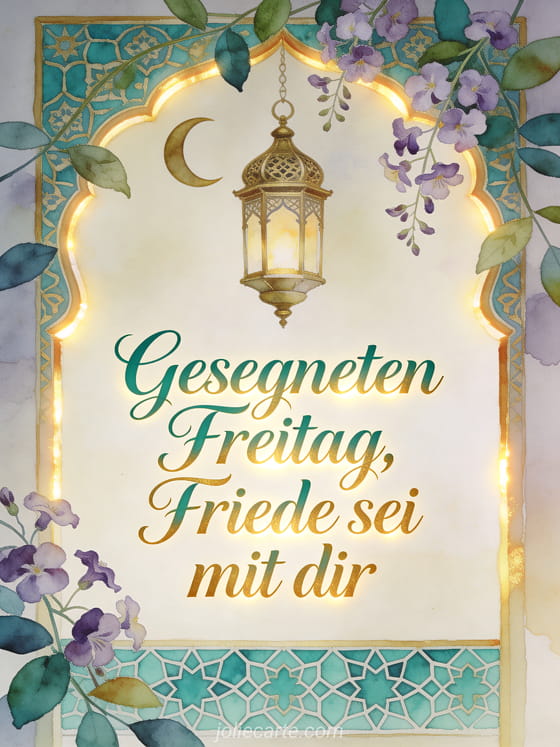 Sende einen friedlichen Wunsch zum gesegneten Freitag mit smaragdgrüner und goldener Kalligrafie, Blaukissenblüten, einer verzierten Laterne, einem Halbmondmotiv und türkisfarbenen Fliesen. Entdecke auch Bilder wünschen einen schönen Freitag, ein Schönen Freitag Bild kostenlos oder schönen Freitag mit Bild.