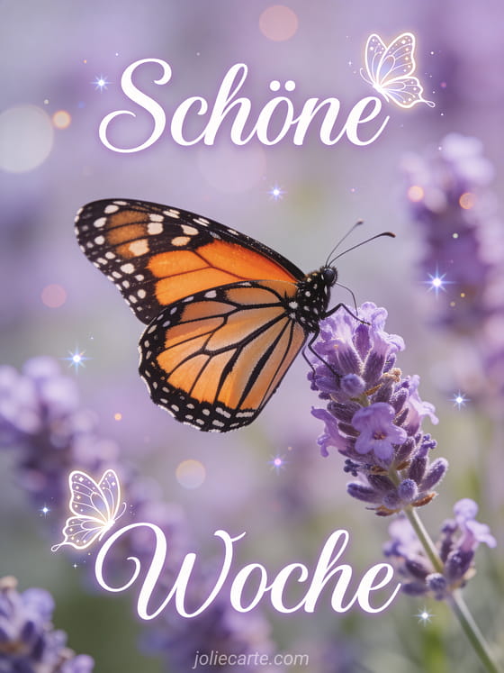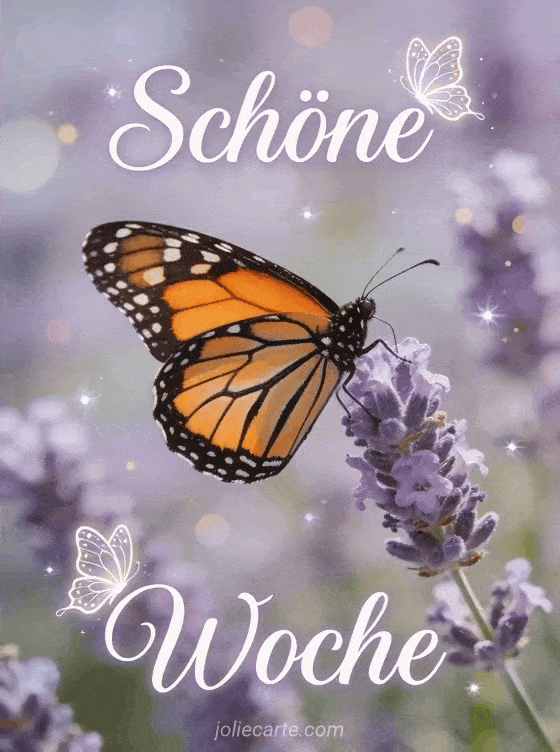Sende ein schönes Woche-Bild und bringe etwas Natur-Gelassenheit in jemandes Tag. Ein wunderschöner Monarchfalter auf Lavendelblüten schafft eine friedliche und duftende Atmosphäre. Entdecke auch ein gif schöne woche lustig oder eine Karte schöne woche motivation.