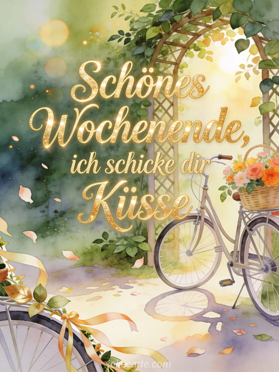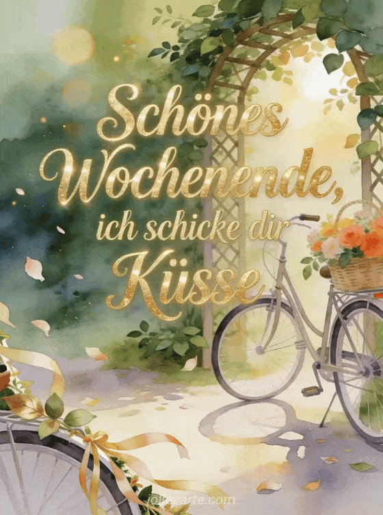 Teile eine zärtliche Wochenendnachricht mit Champagnerschimmer, einem Vintage-Fahrrad, einer belaubten Gartenlaube und einem Korb voller bunter Blüten. Entdecke auch schönes Wochenende animierte Küsschen, schönes Wochenende Küsse Bild oder schönes Wochenende dicke Küsschen.