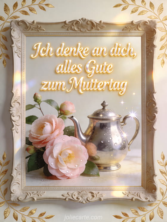 Teilen Sie eine herzliche Muttertagskarte mit einer silbernen Teekanne, frischen Kamelien, ornamentalen Details und leuchtenden Frühlingsreflexen. Entdecken Sie auch Gedichte für Mütter, ein Foto zum Muttertag oder Worte zum Muttertag.