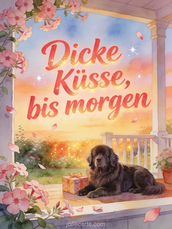 Teile eine fröhliche Nachricht für morgen mit korallroter Schrift, Phloxblüten, einem ruhenden Neufundländer Hund und einem Geschenk in einem leuchtenden Verandagarten. Entdecke auch eine Küsse bis morgen Karte, eine Bild bis morgen Küsschen Karte oder eine guten abend und gute nacht küsse bis morgen Karte.