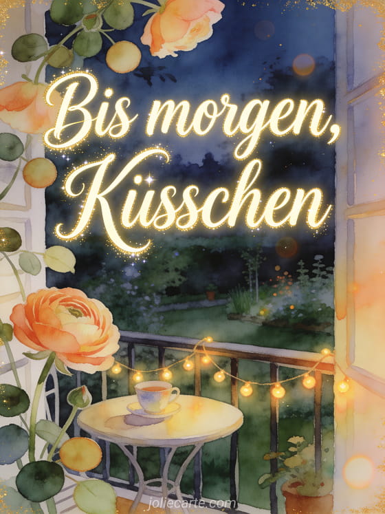 Teile einen gemütlichen Abschied mit cremefarbener Aquarellschrift, Ranunkelblättern über dem Rand, einem kleinen Balkontisch mit Tasse und warmen Lichterketten in einem ruhigen Abendgarten. Entdecke auch ein Foto Küsse bis morgen GIF, eine Küsschen und bis morgen Bild Karte oder einen Gruß mit animierte Küsschen bis morgen.