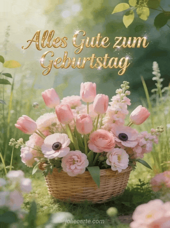 Teile eine elegante Geburtstagskarte mit rosa Tulpen, Anemonen und Lisianthus im Korb vor hellem Gartengrün. Entdecke auch bild alles gute zum geburtstag mit blumen, alles gute zum geburtstag musikalisch und alles gute zum geburtstag katze gif.