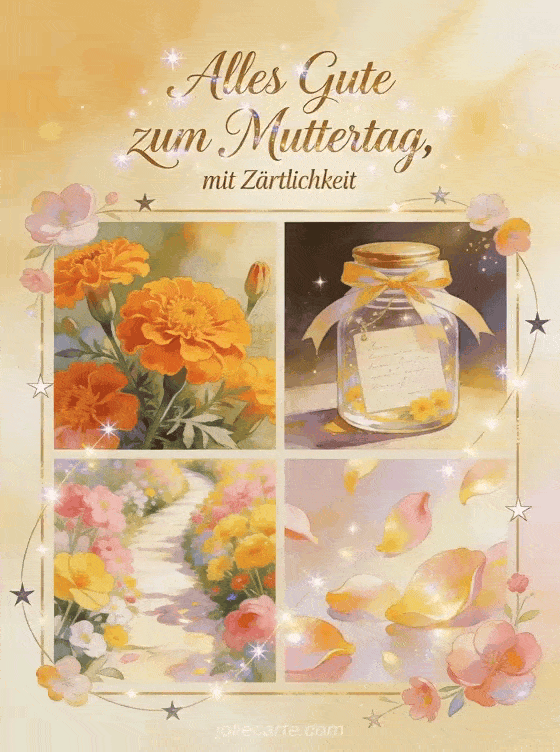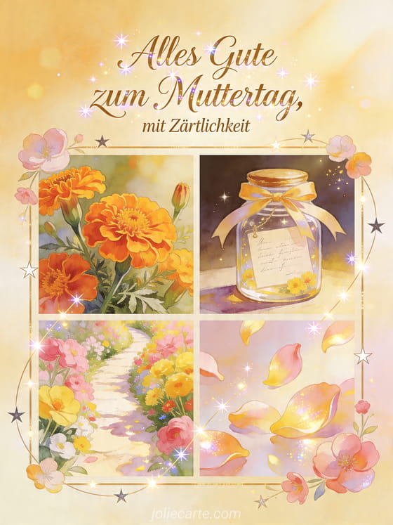 Teile eine sonnige Muttertagskarte mit gemalter Kalligrafie, Studentenblumen, einem Erinnerungs-Glas mit Schleife, einem hellen Blumenweg und schimmernden BlĂŒtenblĂ€ttern. Entdecke auch ein Muttertagszitat, eine Alles Gute zum Muttertag Schwiegermutter oder Muttertag fĂŒr meine Tochter.