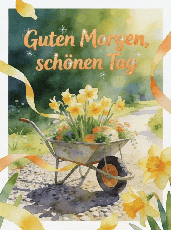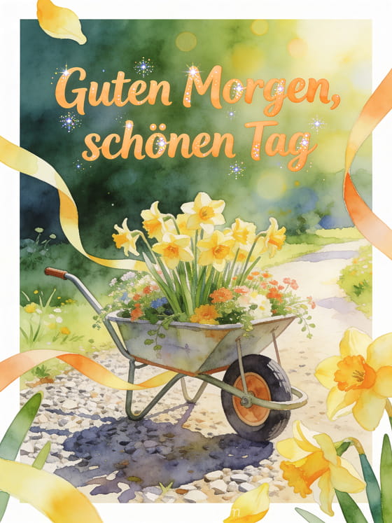 Sende eine blumige Guten-Morgen-Karte mit fröhlicher apricotfarbener Aquarellschrift, einem blumengefüllten Gartenwagen, Narzissen, einem sonnigen Kiesweg und hellen Schleifenbändern. Entdecke auch schöne kostenlose virtuelle Guten-Morgen-Karte, kostenlose virtuelle Guten Morgen Karten oder Guten Morgen und beste Wünsche.