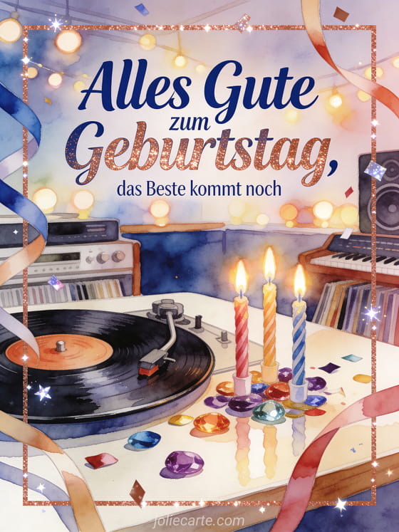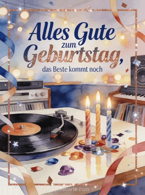 Sende einen Geburtstagsgruß mit Stil mit einer Schallplatte, die neben leuchtenden Kerzen auf einem polierten Tisch dreht. Kräftiges Konfetti, Schleifen und weiche Aquarelllichter schaffen eine festliche Musikzimmer-Szene. Entdecke auch geburtstagsgedicht für meinen sohn, berührender Text zum Geburtstag meines Sohnes oder gedicht zum geburtstag meines sohnes.