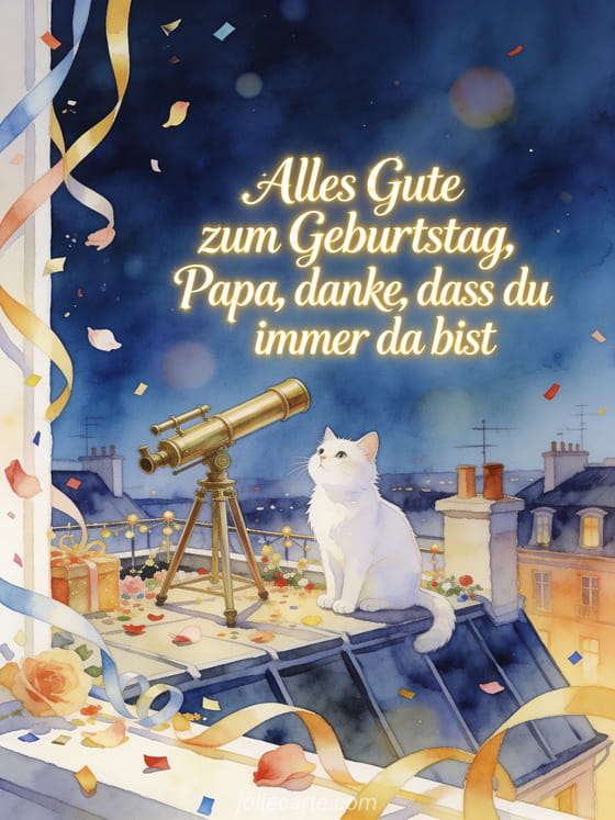 Teile einen Brief zum Geburtstag für Papa mit einer warmen Aquarellszene, die ihm dafür dankt, dass er immer da ist. Dazu passen auch Alles Gute zum Geburtstag mein geliebter Papa, Alles Gute zum Geburtstag für Papa oder alles Gute zum Geburtstag mein Papa.
