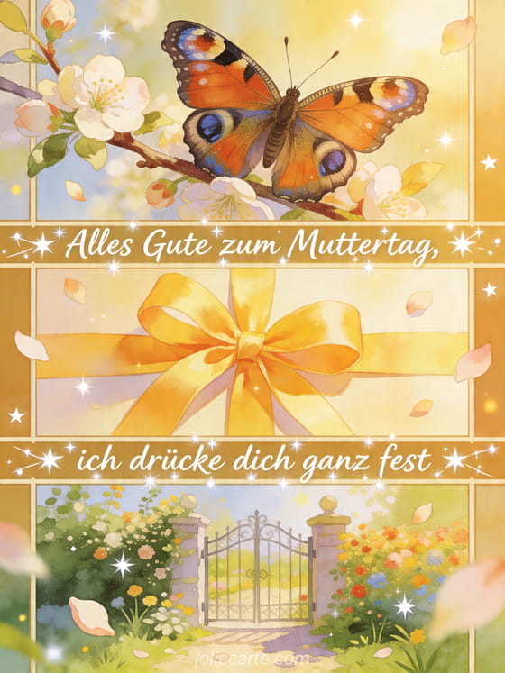 Teile eine süße Muttertagskarte mit einer festen Umarmung, einer Illustration aus drei Feldern, einem Tagpfauenauge, einer Geschenkschleife und einem fröhlichen Gartentor. Entdecke auch Muttertagsworte, einen Muttertagstext oder ein Gedicht für die Mutter.