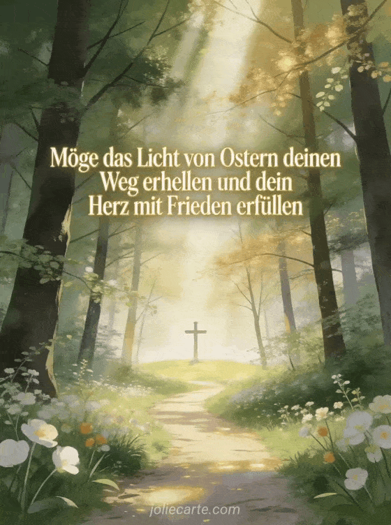 Teilen Sie diese bewegende christliche Osterbotschaft, die Licht auf Ihrem Weg und Frieden in Ihrem Herzen wünscht. Entdecken Sie auch eine frohe christliche Osterkarte, eine religiöse Osterbilder-Karte oder eine schöne religiöse Osterkarte.