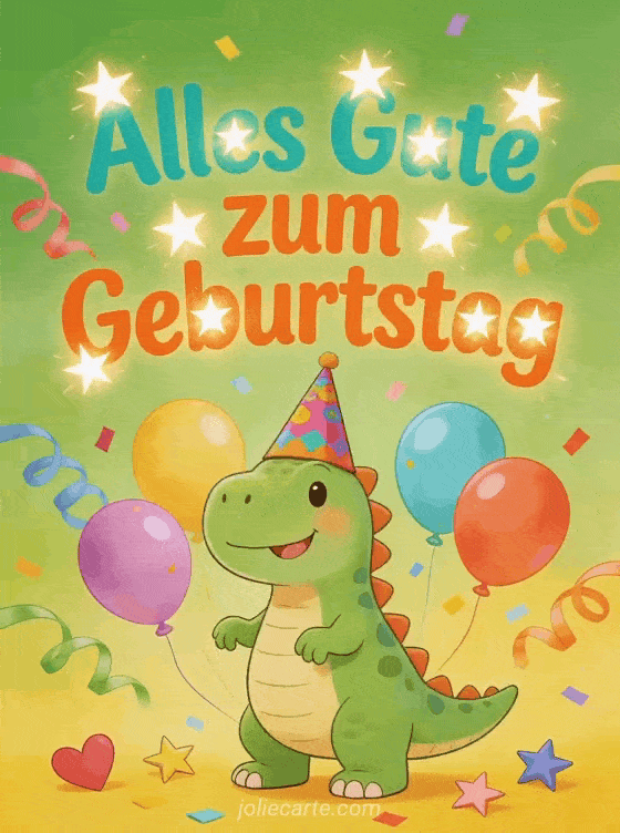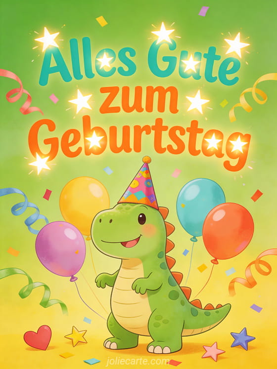 Feiere mit diesem Cyber Geburtstagskarten Kind Design mit einem fröhlichen grünen Dinosaurier mit Partyhut, bunten Ballons, Luftschlangen und Konfetti auf leuchtend grün-gelbem Hintergrund. Entdecke auch kostenlose Geburtstagskarte Kind, Banner alles Gute zum Geburtstag Baby und alles Gute zum Geburtstag Baby gif.