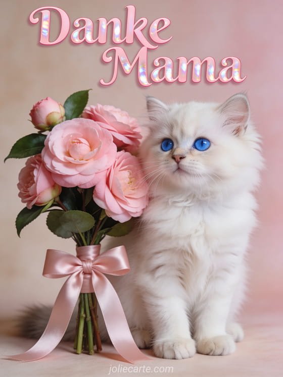 Zeigen Sie Mama Ihre Dankbarkeit mit dieser herzerwärmenden kostenlosen Grußkarte. Ein entzückendes weißes Perserkätzchen mit blauen Augen sitzt neben einem zarten Strauß rosa Kamelien, der mit einer Satinschleife gebunden ist, auf einem sanften rosa Hintergrund. Entdecken Sie auch eine Muttertagskarte mit Blumen, eine Muttertagskarte oder eine Muttertagskarte mit Bildern.