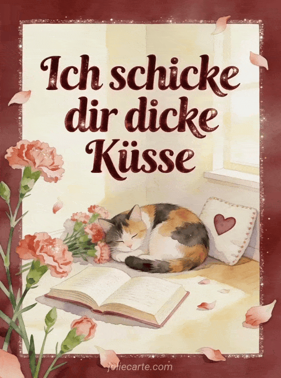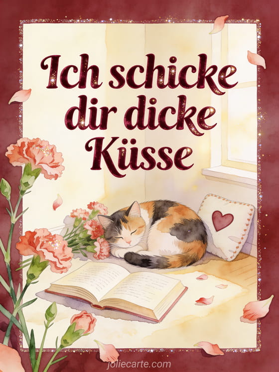 Sende einen zärtlichen Gruß voller dicker Küsse mit einer gemütlichen Aquarellszene, einer Katze und burgunderroter Schrift. Entdecke auch ein Bild voller Küsschen, kleine küsschen oder ein küsschen mein herz gif.