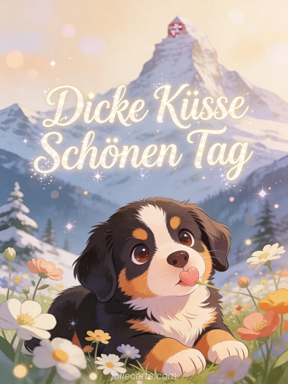 Teile Wärme mit dieser Karte dicke Küsse schönen Tag mit einem niedlichen Berner-Sennenhund-Welpen umgeben von Alpenblumen in den Schweizer Bergen. Entdecke auch eine Karte von guten morgen mein schatz schönen tag oder sprichwort schönen tag.