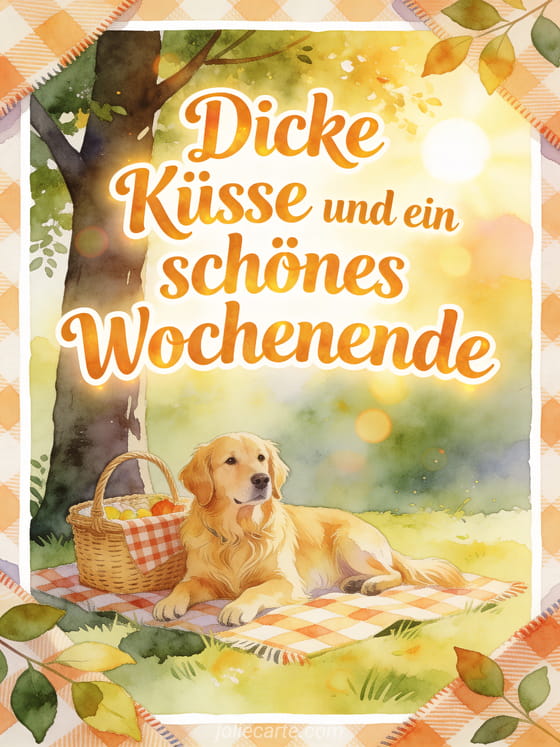 Wünsche ein fröhliches Wochenende mit verspielter Schrift, einem Golden Retriever Hund unter einem sonnigen Baum, einem Picknickkorb und einer karierten Decke. Entdecke auch schönes Wochenende dicke Küsse gif, schönes Wochenende Schmetterling Küsse oder GIF schönes Wochenende Küsschen.