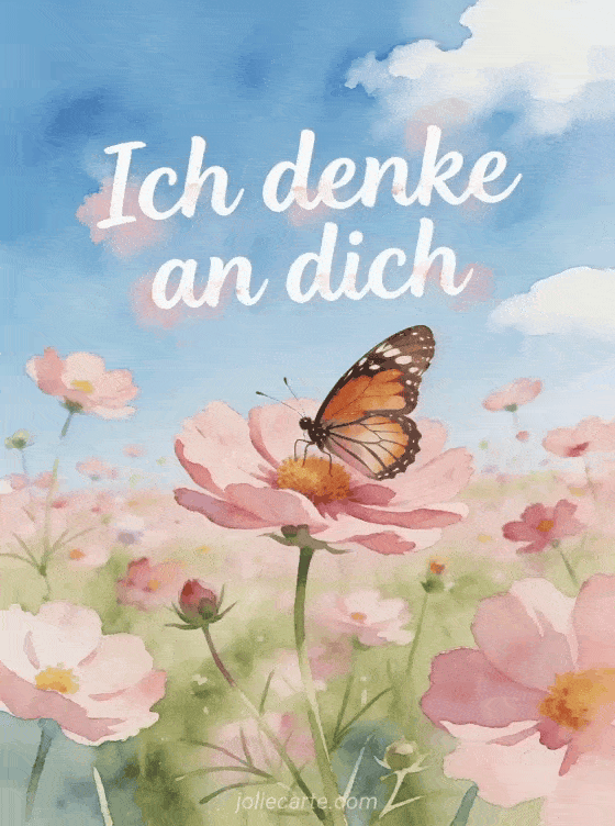 Lass jemand Besonderen wissen, dass du an ihn denkst, mit dieser zarten Aquarellkarte mit einem Monarchfalter auf einer rosa Cosmea in einem sommerlichen Blumenfeld. Eine leichte und poetische Botschaft zum Teilen. Entdecke auch eine Karte ich denke ganz fest an dich oder eine Karte ich denke an dich animiertes Gif.