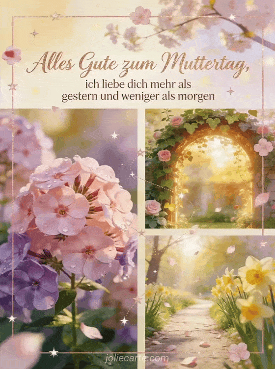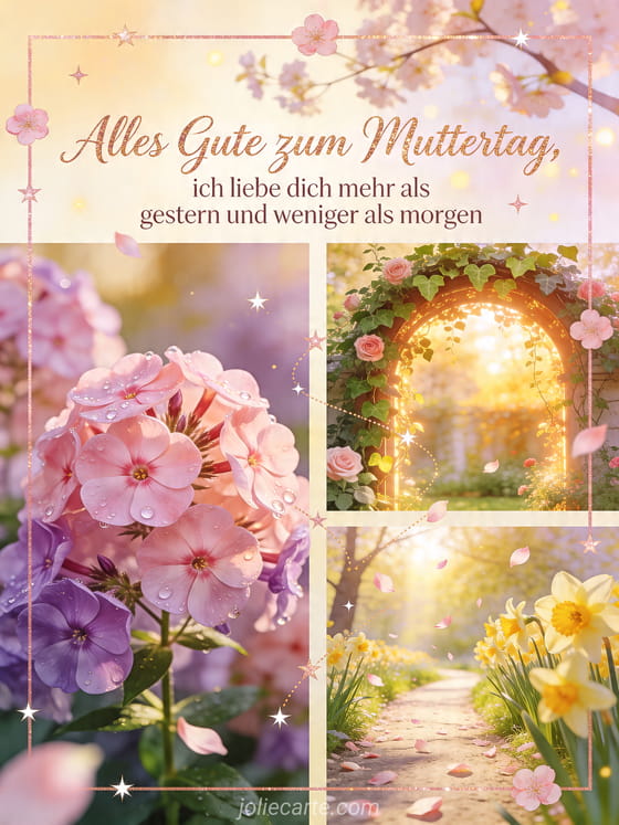 Teile ein Gedicht zum Muttertag in einer verträumten dreiteiligen Illustration mit üppigem Phlox, leuchtendem Gartenbogen, schwebenden Blütenblättern über einem hellen Weg, Blüten und Sternen. Entdecke auch Bilder zum Muttertag, Gedichte für Mütter oder Foto zum Muttertag.