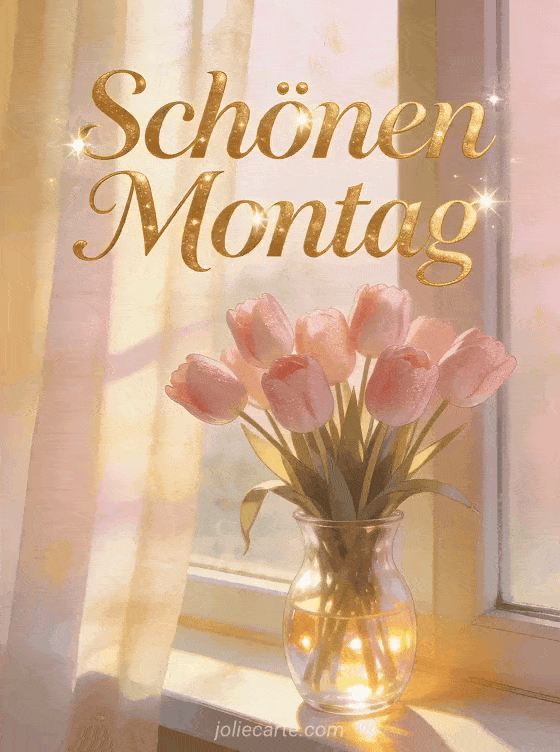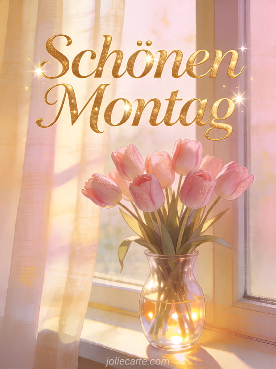Starte die Woche mit dieser eleganten Karte, die einen Strauß rosa Tulpen in einer Glasvase am Fenster im weichen Morgenlicht zeigt. Entdecke auch guten morgen schönen montag schöne woche küsschen, guten morgen montag guter start der woche oder lustig schönen montag.
