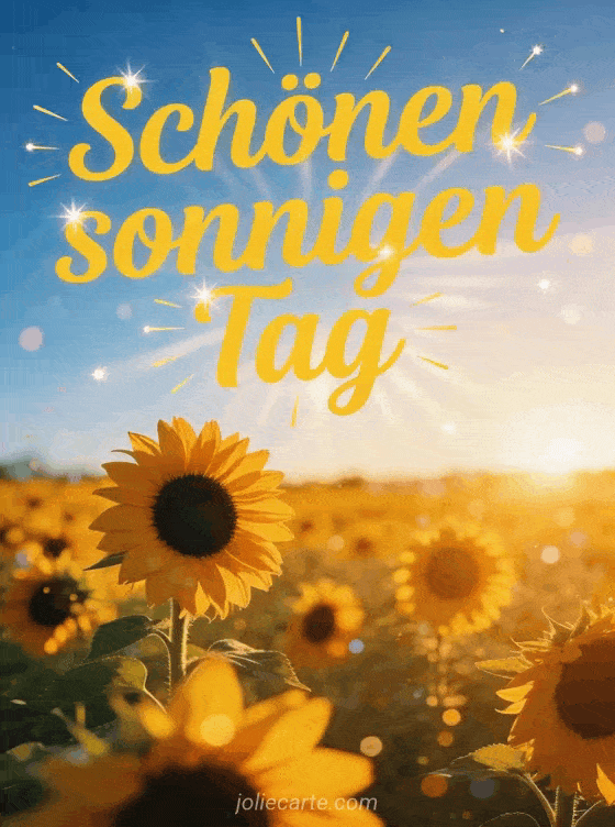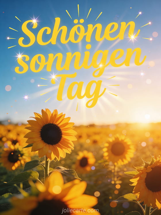 Wünsche jemandem einen wunderschönen sonnigen Tag mit dieser traumhaften Sonnenblumenfeld-Karte im goldenen Licht. Entdecke auch eine Sonnenschein-Schöner-Tag-Karte oder eine Guten-Morgen-Schönen-Tag-Nachricht-Karte.