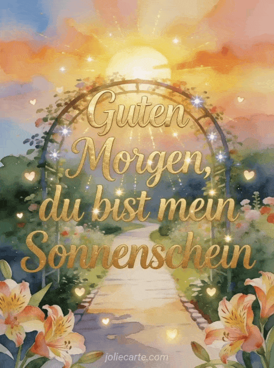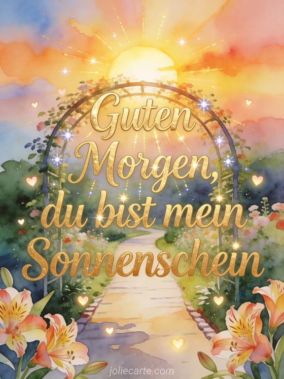 Sende eine romantische Guten-Morgen-Nachricht für meine Freundin mit strahlender goldener Aquarellschrift, einem leuchtenden Sonnenaufgang, einem gebogenen Gartenweg, Alstroemerien und kleinen schwebenden Licht-Herzen. Entdecke auch kostenlose Guten-Morgen-Karten, Guten Morgen Nachricht Bild oder Guten-Morgen-Karten für Freunde.