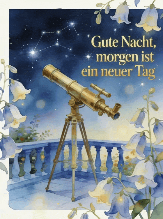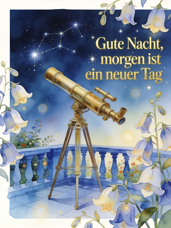 Teile gute Nacht, morgen ist ein neuer Tag mit einer hoffnungsvollen Aquarell-Nachtszene, einem Messingteleskop, das auf ein helles Sternbild zeigt, einer blauen Gartenterrasse und Glockenblumen. Du kannst auch eine romantische Gute-Nacht-Nachricht, eine Nachricht um einer Freundin Gute Nacht zu wünschen oder eine Karte zum Gute-Nacht-Wünschen senden.